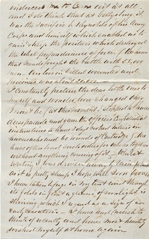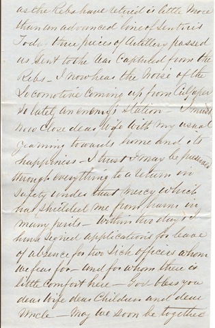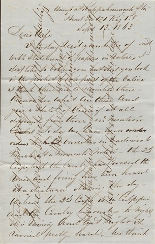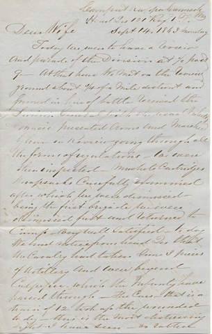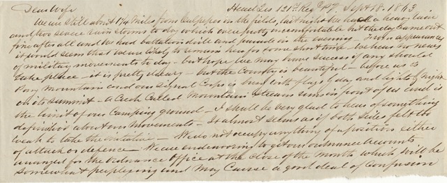 Another day is added to the pain of absence but I trust under the mercy which has guarded me hitherto that it but brings me the nearer to an early return to you Last night it rained again and to day We have rather cold weather – We had instruction in Tactics in the morning and Battalion drill – Parade & exercise in the manual for two hours in the afternoon – the ground being rather difficult to march over – We are in a pretty country and I believe occupy somewhere about the Centre of the Army – there are other troops to the right and left and I believe also to our front – from the papers the rebels seem to know out movements with a good deal of precision still but I am not surprised at it when we pass houses where we see men & women of all ages living undisturbed who would be easily able to calculate what passes under their eyes and compare notes with others similarly situated. We took a little walk in the evening to the banks of Mountain Run about 200 yds in our front and saw a muddy stream with about 3 feet of width and a good deal of drift wood floating in it – We forded it the other day less than knee deep – The bands and bugles are now all beating the tattoo and soon all ought to be quiet…