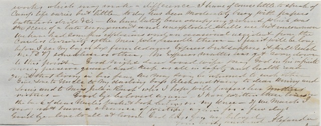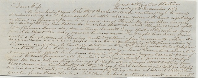The idea to day seems to be that we shall make another push towards Fredricksburg and have another battle. We are indeed to have eight days rations in hand from tomorrow and think we may then move. This sort of thing has become so periodic that we don’t think much of it but of course some day something must come of it. I think it very possible that we may move tomorrow. The night has been fine with a high wind blowing until within a few moments when it has gone down and all is quiet. We hear the puffing of the locomotive as it passes on its way to Catlett’s station– the RR being about 200 yds from our tents. I had thought this company had come to a close but I hear great efforts have been made to forward convalescents to camp and to send forward all invalid soldiers, which I presume signifies that the men whom they relieve go to the front. I hear that rations for 88,000 men are distributed to this army which allowing 20 pct for supply trains and details would leave 60,000 fighting men. I should think a greater force than Lee has, but then he has entrenchments and earth works which make a difference. I have of course little to speak of Camp. Life varies but little—today has been moderately busy with papers, battalion drill etc. We have lately been occupying ground which was the scene of a late engagement and unexploded shells are not uncommon. We have had some few explosions and an occasional accident from the careless curiosity of the men who handle them. I fear it will be long before I see my bag or box from Adams express but suppose it will reach me (DV) somewhere or other. No Express matter has yet come down to this point. Good night dear loved wife, may God in his infinite mercy preserve, guard and keep us all in safety and health and grant that living in his fear we may soon be returned to each other. Give love to Uncle, to my darling boys Aleck and Harry, to dear Winny and Louis and to Miss Julia Rush who I hope will possess her mother’s virtues. Good bye beloved again—I have written these lines on the back of dear Uncle’s pocketbook resting on my knee. If we march I may not have a chance of writing again for a few days. Goodbye—Love to all at home. God bless you my beloved,