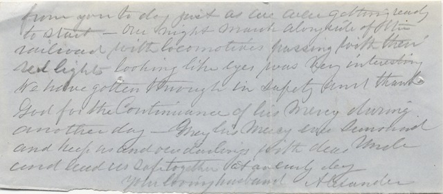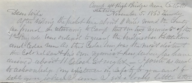 After riding the picket line about 11 miles round the County we found on returning to camp that our two regiments of the 1st Brigade were ordered to guard the bridges over Kettle Run and Cedar Run. As this Cedar run was the most distant, the Colonel sent his own regiment here when we have arrived about 11 O’clock at night. I write as usual to acknowledge my existence in safety to you and to tell you where I am. I got a lovely little letter from you to day just as we were getting ready to start. Our night march along side of the railroad with locomotives passing with their red lights- looking like eyes was very interesting. We have gotten through in safety and thank God for the Continuance of his Mercy during another day. May his Mercy ever surround and keep us and our darlings with dear Uncle and lead us safe together at an early day.