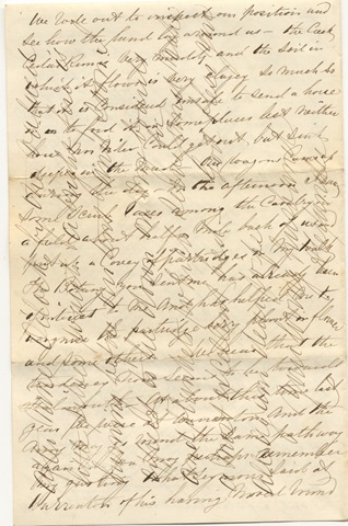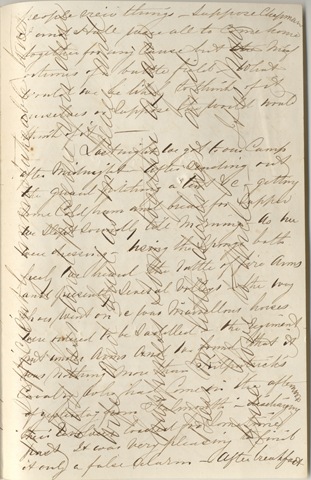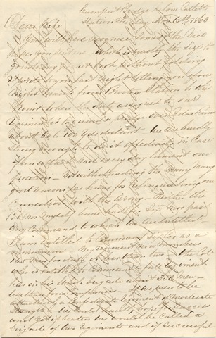 Last night we got to our camp after midnight after sending out the guard pitching a tent- &c Getting some cold ham and bread for supper we slept soundly till morning. As we were dressing- using the sponge bath freely we heard the rattle of fire arms and presently several volleys. The way shoes went on & four marvelous horses were readied to be saddled. The regiment put under arms and we found that it was nothing more than Kilpatrick’s cavalry who had come in the afternoon of yesterday from Falmouth discharging their revolvers loaded for sometime past. It was very pleasing to find it only a false alarm. After breakfast we rode out to inspect our position and see how the land lay around us—the Creek Cedar Run is very muddy and the soil in which it flows is very clayey, so much so that it is considered unsafe to send a horse in or to ford it on some places but neither horse nor rider could get out, but sink deeper in the mud. Our wagons came up during the day. In the afternoon I saw some scrub jays among the Cavalry in a field about half a mile back of us and put up a covey of partridge in my walk. The Botany you sent me has already been of interest to me and has helped me to recognise the partridge berry plant in flower and some others. We hear that the tendency now seems to be towards Falmouth—at about this time last year we were at Warrenton and the Army may go mind the same pathway again. You may perhaps remember my quoting what Seymour said at Warrenton of his having moved round in a circle on a radius of a 100 miles. We have done the same. We augur well to our cause from the reports of southern finances and scarcity of food. I hope we may not be mistaken but that the matter is to draw to a close without any difficulty. North Carolina seems to almost ready to give up her connections with rebeldom, at least she is getting ready to yield to popular will when manifested in sufficiently unmistakable tones. God bless and preserve you dear wife and lead us in peace and happiness soon together again. Bless my little darlings and give love to Uncle. It is now after nine o’clock by the valued little silver watch. A bright fire is burning before our tent and soon I expect to lie down on my boards and blankets which serve and make a most excellent bed. God bless you all again dear wife,