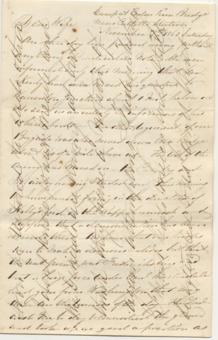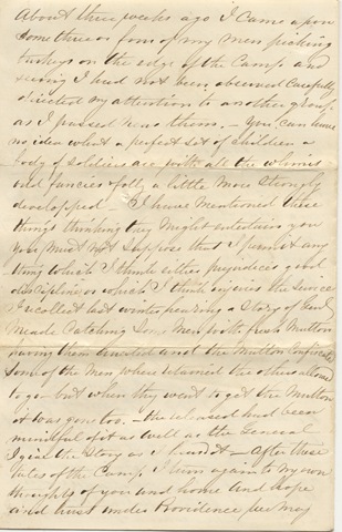 Don’t you think I have a sad set of scamps and yet all the above I am presumed to be entirely ignorant of and I don’t believe any of them think I know of it a circumstance which often happens. About three weeks ago I came where some three or four of my men picking turkeys on the edge of the camp and seeing I had not been observed carefully directed my attention to another group as I passed near them. You can have no idea what a perfect set of children a body of soldiers are with all the whims odd fancies & folly a little more strongly developed. I have mentioned these things thinking they might entertain you. You might not supposed that I permit anything which I think either prejudices good discipline or which I think injures the service. I recollect last winter hearing a story of Gen Meade catching some men with fresh mutton having them arrested and the mutton confiscated. Some of the men were retained the others allowed to go. But when they went to get the mutton it was gone too. The released had been mindful of it as well as the General. I give the story as I heard it. After these tales of the camp I turn again to my own thoughts of you and home and hope and trust under Providence we may soon be restored to each other. I don’t know what Meade and the Generals are driving at but think they have a notion of again attempting Fredericksburg. I trust God’s mercy will still be extended to us and that we may soon have an end of war. Good bye beloved wife god bless you the dear children and uncle. Give love to sisters and brothers