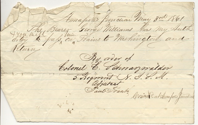 Citation: Pass for George Williams. Annapolis Junction, 3 May 1861. Ams 811/2.6