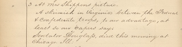 A skirmish in Virginia between the Federal & Confederate troops, to our advantage, at least so our papers say. Senator Douglass, died this morning at Chicago. Ill: